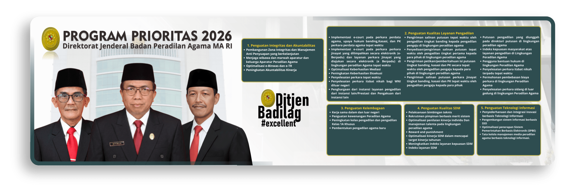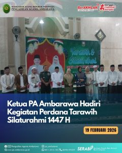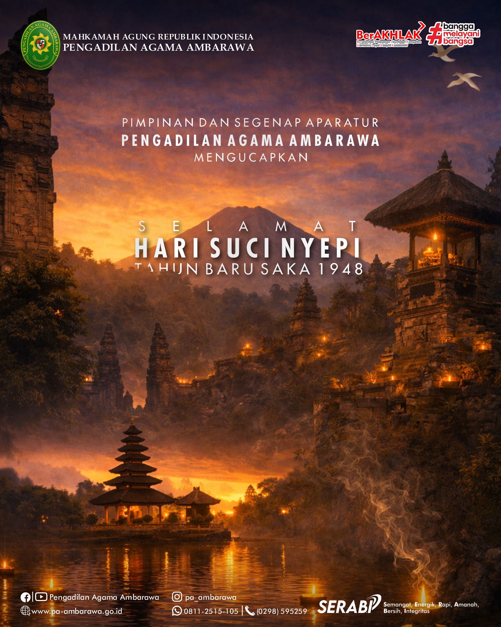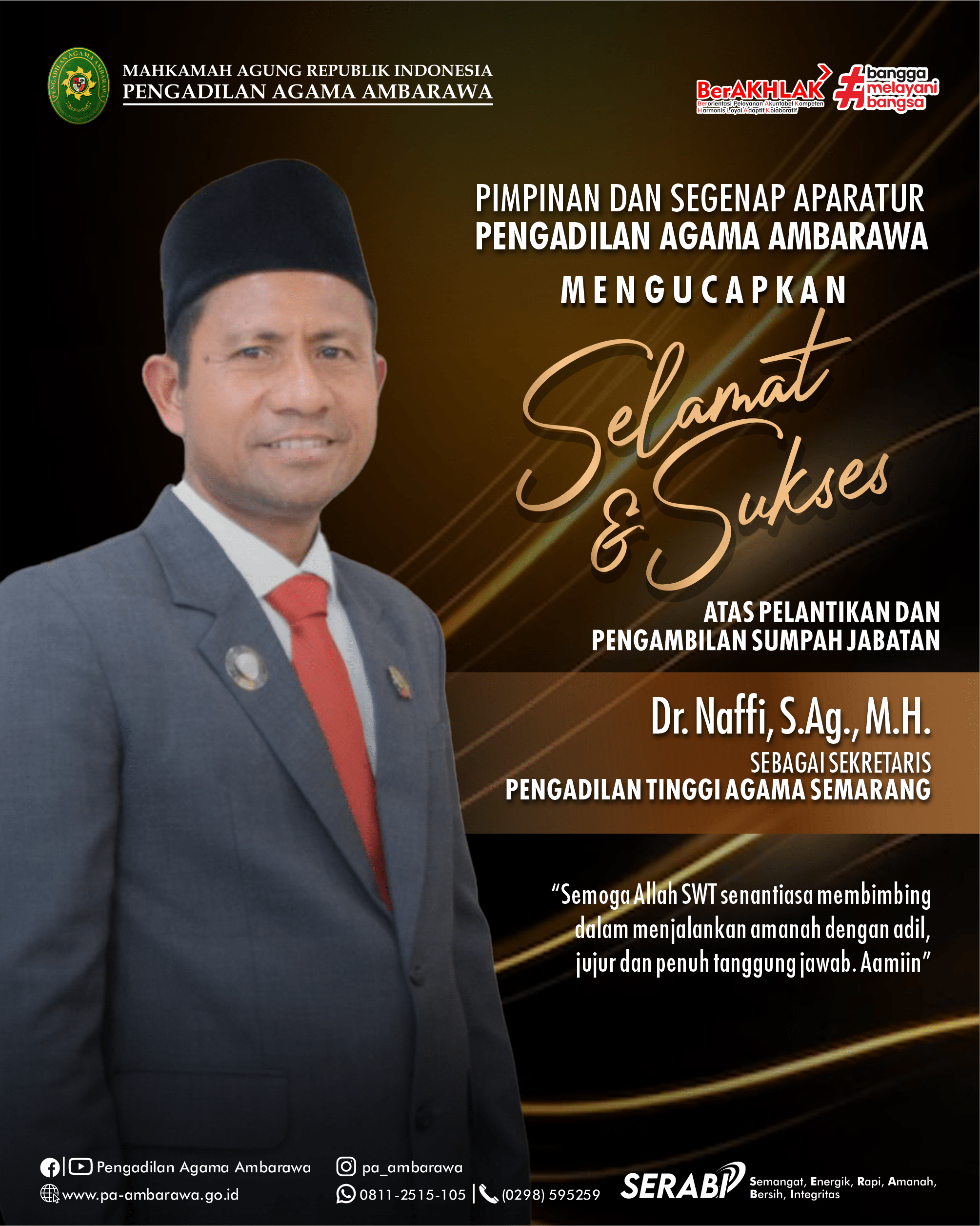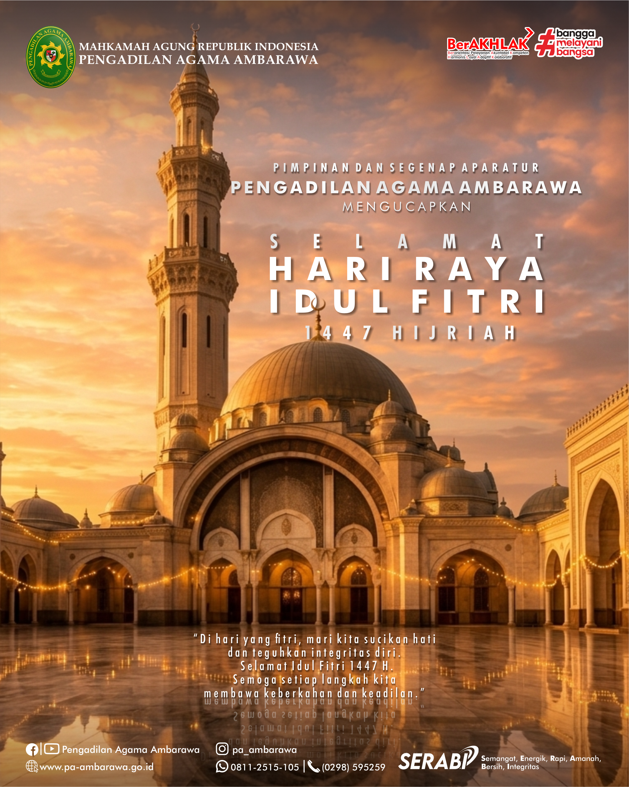 Selamat datang di Website Resmi Pengadilan Agama Ambarawa. Website ini kami hadirkan sebagai sarana informasi dan pelayanan bagi masyarakat pencari keadilan.