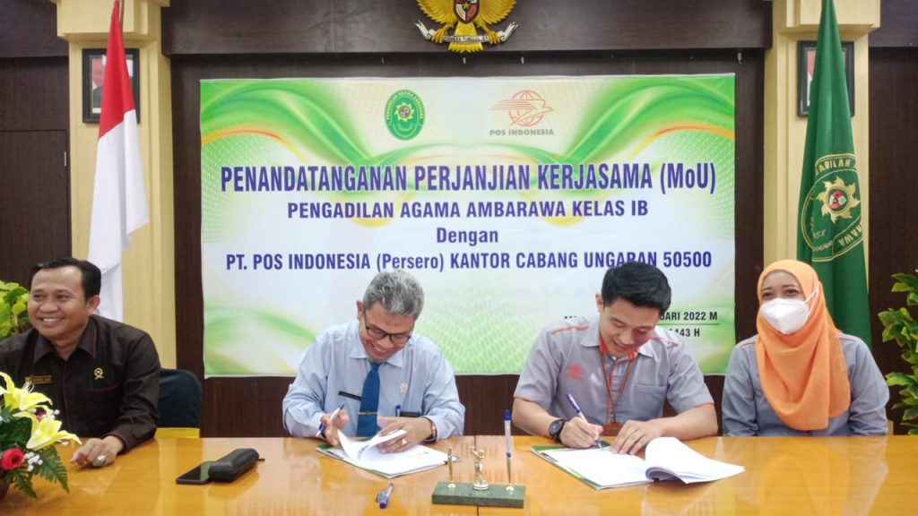 PENANDATANGANAN MoU PENGADILAN AGAMA AMBARAWA DENGAN PT. POS INDONESIA (PERSERO) Menindaklanjuti komitmen bersama antara Pengadilan Agama Ambarawa dengan PT. Pos Indonesia (Persero), secara resmi kedua instansi tersebut telah mengikatkan diri dalam sebuah perjanjian kerjasama. Penandatanganan tersebut dilaksanakan Rabu, 23 Februari 2022 di Pengadilan Agama Ambarawa. Poin penting dalam kerjasama tersebut adalah terkait […]