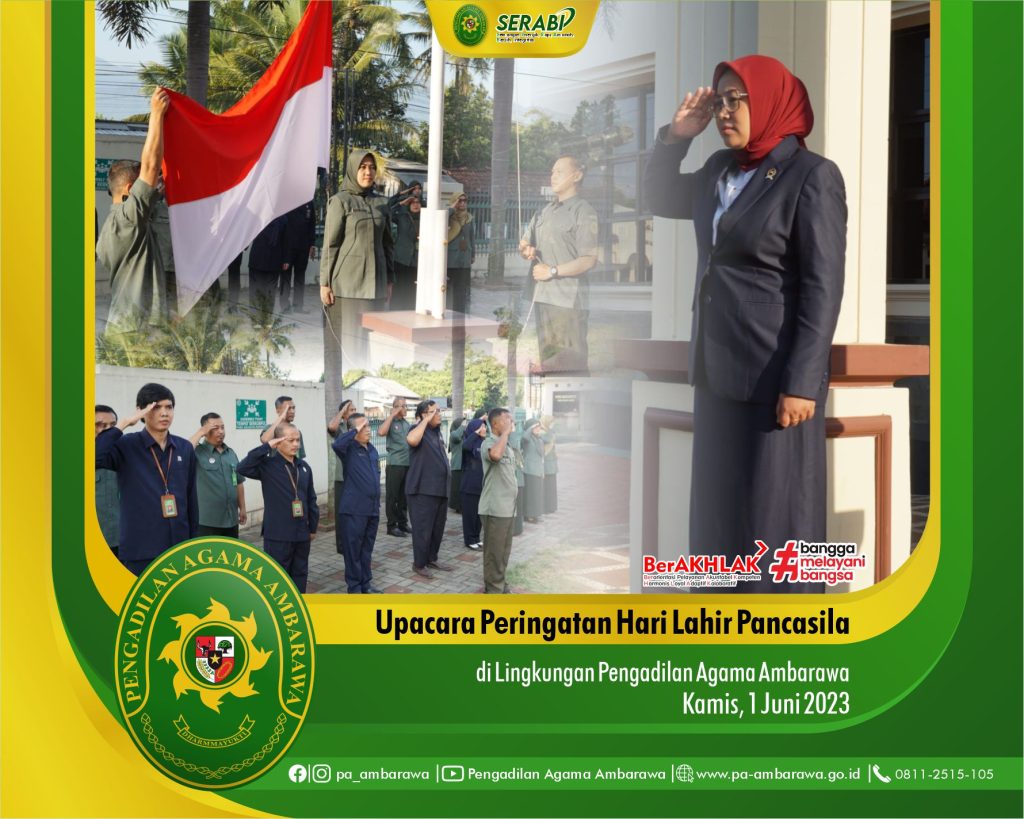 Bertempat di halaman depan Pengadilan Agama Ambarawa pada hari Kamis, 1 Juni 2023, segenap Pimpinan, Hakim, Pegawai dan Staff Pengadilan Agama Ambarawa telah melaksanakan Upacara Peringatan Hari Lahir Pancasila. Bertindak Sebagai Inspektur Upacara adalah Ketua Pengadilan Agama Ambarawa, Ibu Hj. Izzatun Tiyas Rohmatin, S.H.I., S.H., M.H., dalam amanatnya beliau membacakan amanat dari Gubernur Jawa Tengah […]