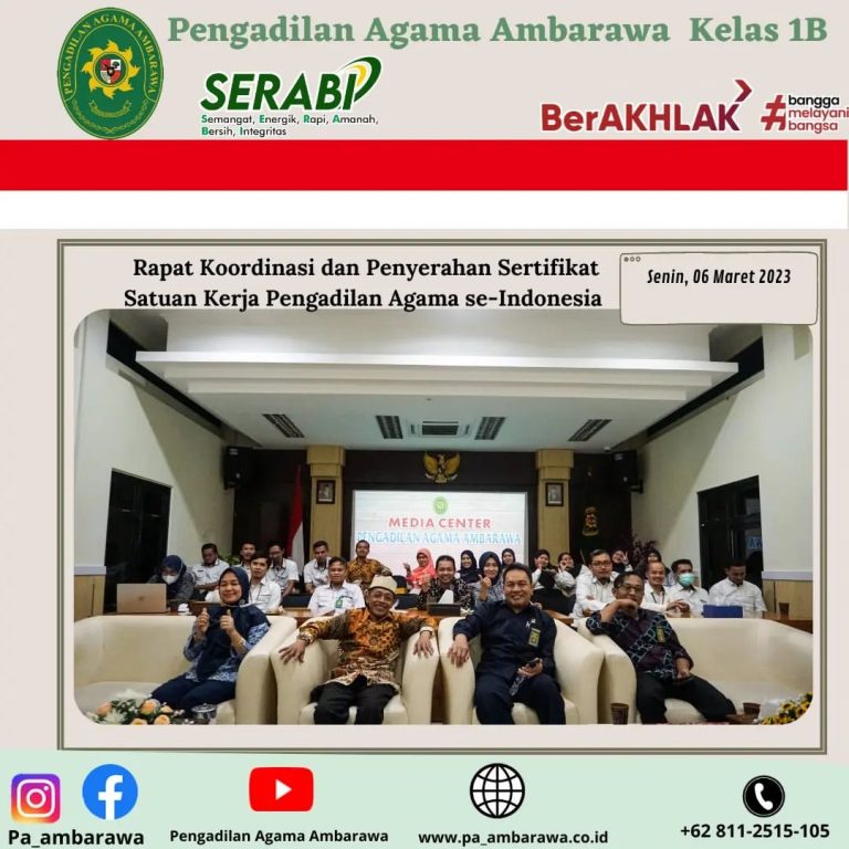 Bertempat di ruang Aula Pengadilan Agama Ambarawa telah dilaksanakan rapat koordinasi dengan PA seluruh Indonesia melalui zoom meeting. Rakor kali ini dihadiri oleh Pejabat Struktural, Sekretaris, Panitera,Pegawai dan juga PPNPN ikut menghadiri zoom meeting. Dalam pembukaan rakor yang dipimpin oleh Ketua Mahkamah Agung YM Prof. Dr. H. M. Syarifuddin., S.H., M.H