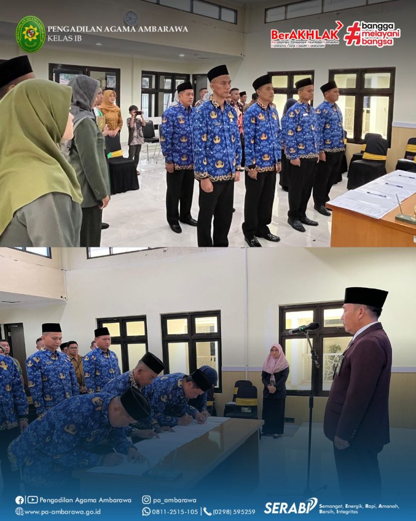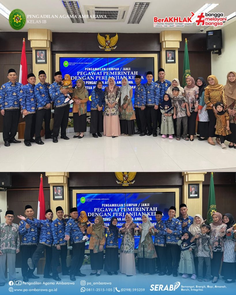 Ambarawa – Ketua Pengadilan Agama Ambarawa secara resmi melantik delapan Pegawai Pemerintah dengan Perjanjian Kerja (PPPK) pada Senin (1/9/2025) di aula Pengadilan Agama Ambarawa. Acara berlangsung khidmat dan penuh haru, dihadiri oleh para pejabat, pegawai, serta keluarga yang turut mendampingi. Dalam arahannya, Ketua Pengadilan Agama Ambarawa mengingatkan bahwa pelantikan ini merupakan rahmat Allah SWT yang patut disyukuri. Sejak saat ini para PPPK memiliki hak dan kewajiban sebagaimana aparatur lainnya, sehingga rasa syukur tersebut harus diwujudkan melalui semangat kerja, disiplin, loyalitas, integritas, dan profesionalisme.