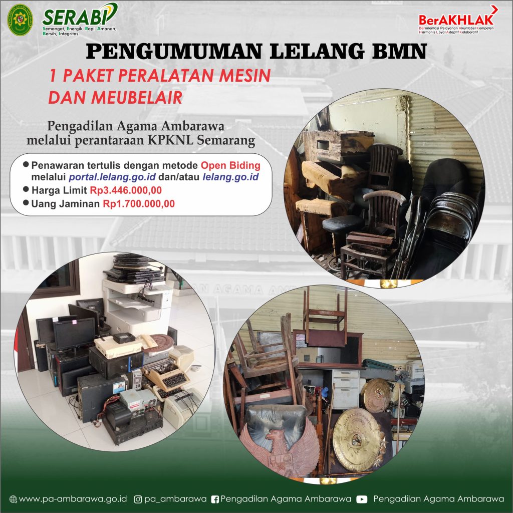 Assalamualaikum Wr. Wb. Pengadilan Agama Ambarawa melalui perantaraan Kantor Pelayanan Kekayaan Negara dan Lelang (KPKNL) Semarang akan melaksanakan lelang Barang Milik Negara dengan penawaran tertulis melalui aplikasi lelang internet dengan penawaran terbuka (Open Bidding) tanpa kehadiran peserta lelang. Informasi lebih lanjut dapat dilihat pada link surat pengumumam di bawah ini : PENGUMUMAN Demikian disampaikan atas […]