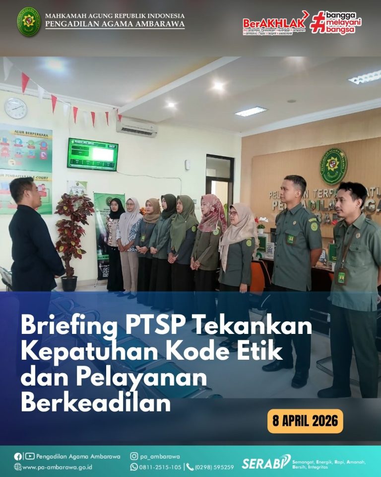 Briefing dipimpin oleh Sekretaris PA Ambarawa, Masnan Eri Yanto, S.E. dan diikuti oleh seluruh petugas PTSP. Dalam arahannya, ditegaskan bahwa kode etik pegawai merupakan landasan utama dalam menjalankan tugas dan fungsi pelayanan publik. Setiap pegawai diharapkan mampu menjaga integritas, bersikap profesional, serta menjunjung tinggi kejujuran dan tanggung jawab dalam setiap proses pelayanan.