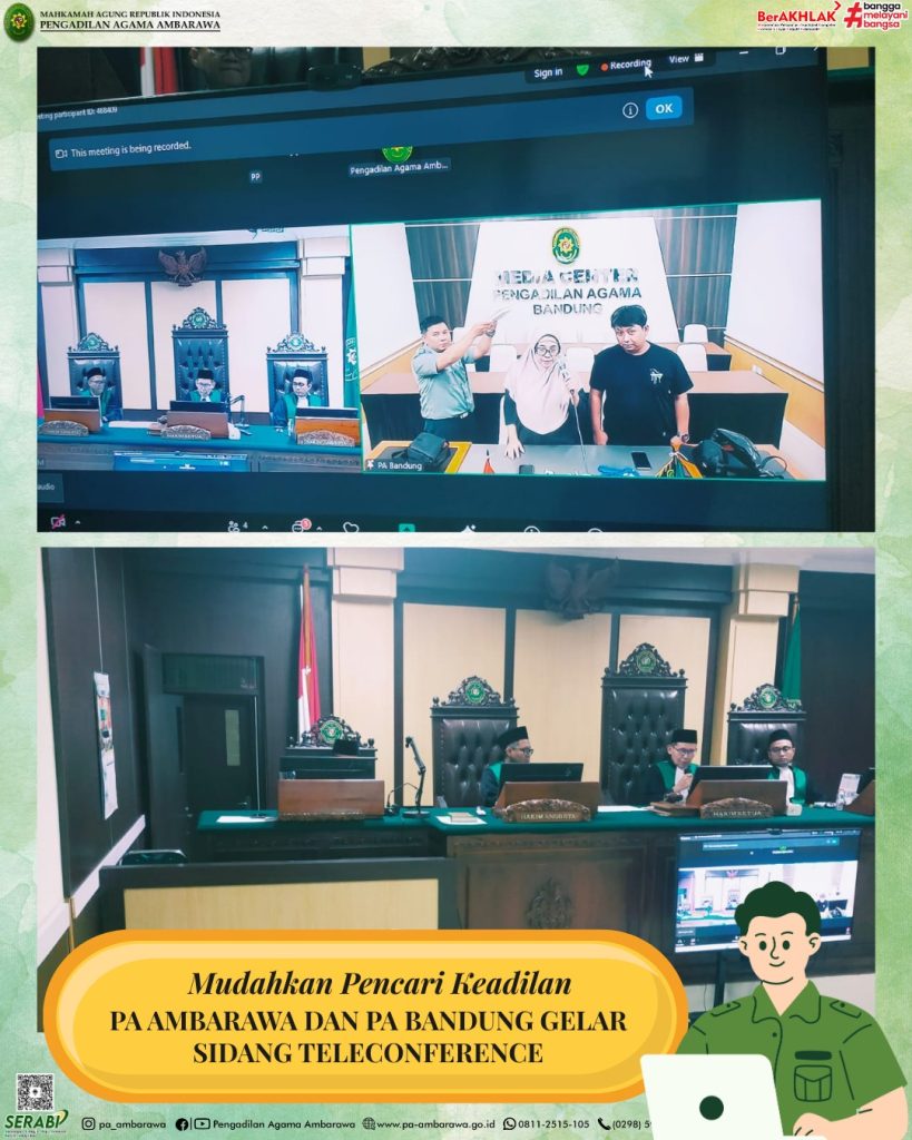 Selasa (21/10/2025), Pengadilan Agama Ambarawa kembali menunjukkan komitmennya dalam memberikan pelayanan prima bagi masyarakat pencari keadilan. Bersama Pengadilan Agama Bandung, digelar sidang teleconference dalam perkara yang telah memasuki tahap pembuktian. Dua orang saksi yang berdomisili di Bandung memberikan keterangan secara daring melalui sistem video conference setelah tim IT dari kedua pengadilan berkoordinasi memastikan koneksi berjalan […]