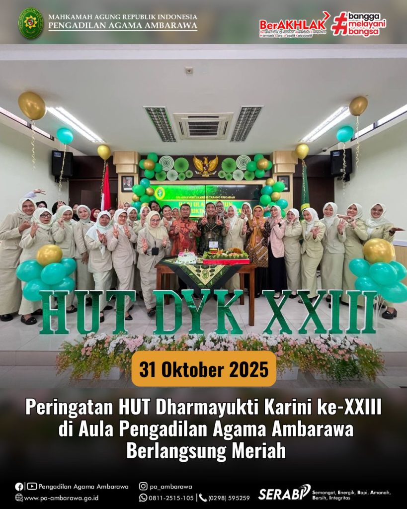 AMBARAWA — Dalam rangka memperingati Hari Ulang Tahun (HUT) Dharmayukti Karini ke-XXIII, Dharmayukti Karini Cabang Ungaran menyelenggarakan kegiatan perayaan pada Jumat, 31 Oktober 2025, bertempat di aula Pengadilan Agama Ambarawa. Acara tersebut dihadiri oleh Ketua Pengadilan Negeri Ungaran, Bapak Golom Sihotang, S.H., M.H., dan Ketua Pengadilan Agama Ambarawa, Bapak Muh. Irfan Husaini, S.Ag., M.Si., […]