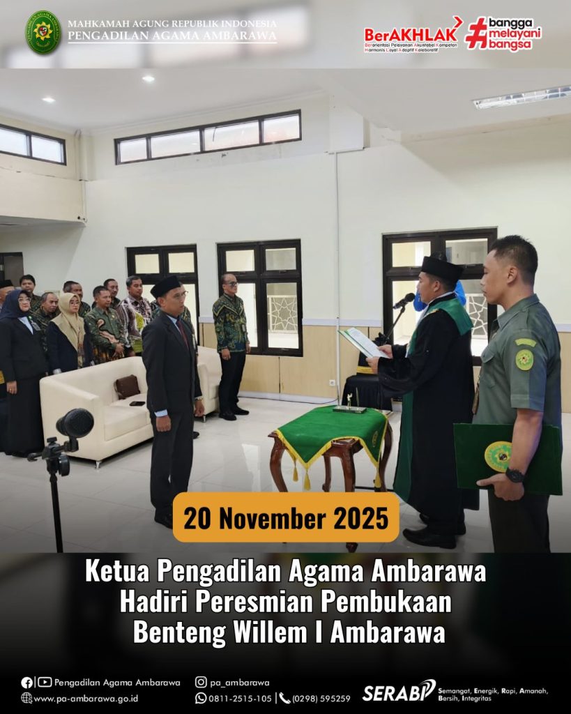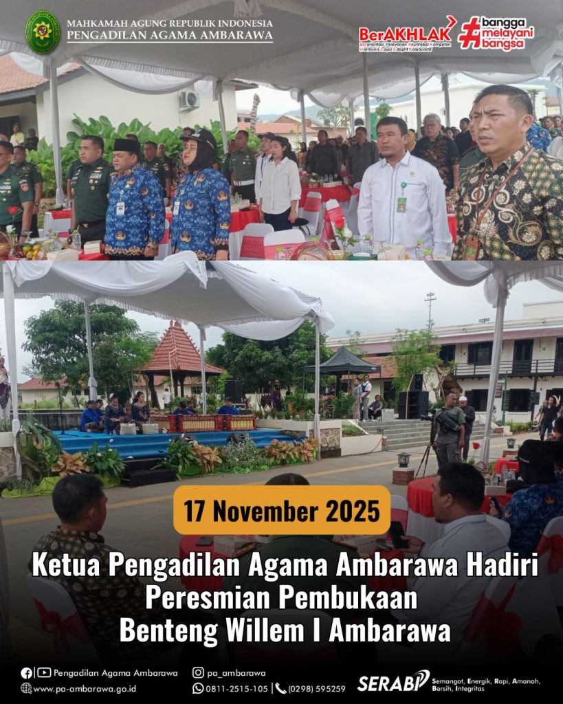 Ambarawa, 17 November 2025 – Ketua Pengadilan Agama Ambarawa menghadiri kegiatan Opening Ceremony Peresmian Pembukaan Benteng Willem I Ambarawa sebagai Destinasi Wisata Edukasi Sejarah, Pusat Oleh-oleh, dan Wisata Kuliner. Acara ini diselenggarakan oleh PT Wisata Lawu Tawangmangu pada Senin, 17 November 2025, bertempat di kawasan Benteng Willem I Ambarawa, Kabupaten Semarang. Acara diawali dengan […]