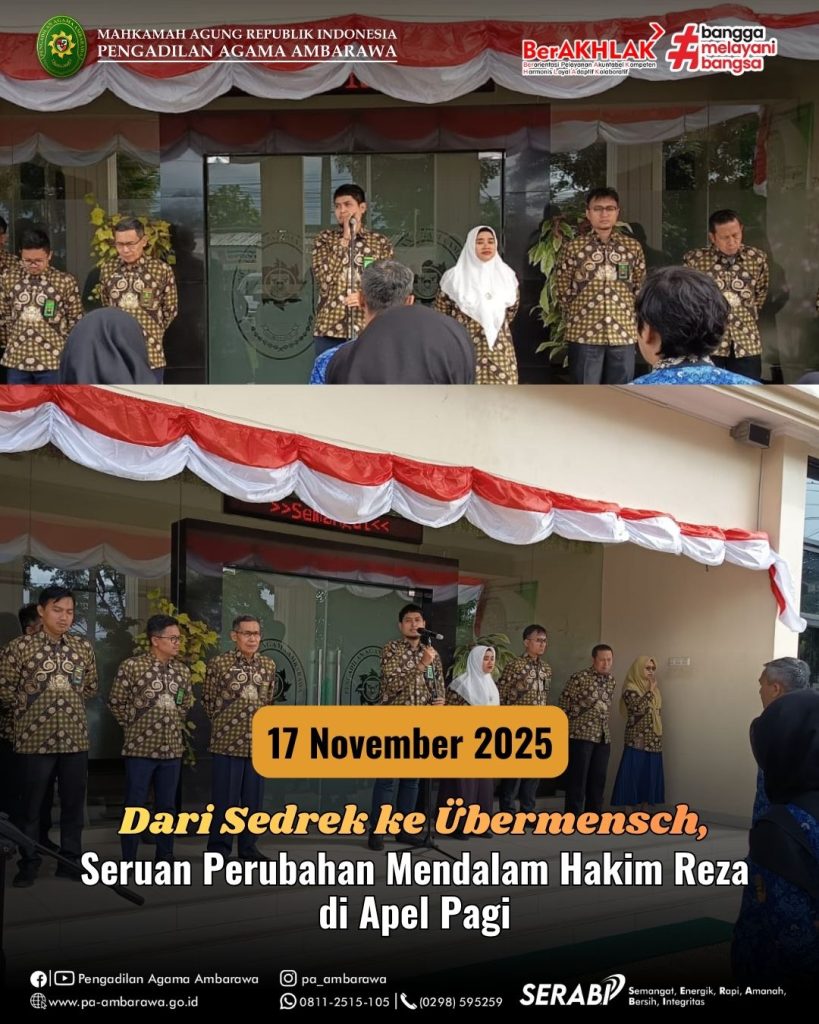 Pengadilan Agama Ambarawa melaksanakan Apel Pagi 17 November 2025 dengan pembina Hakim Reza Kresna Adipraya, S.H., M.H. Dalam amanatnya, beliau menyampaikan ajakan reflektif tentang makna kegagalan, kesiapan menghadapi ujian, dan pentingnya pertumbuhan diri. Hakim Reza mengingatkan bahwa kegagalan bukan sekadar terhentinya proses, namun hasil akhir setelah ikhtiar maksimal. Ia mendorong seluruh aparatur, termasuk pimpinan, untuk […]