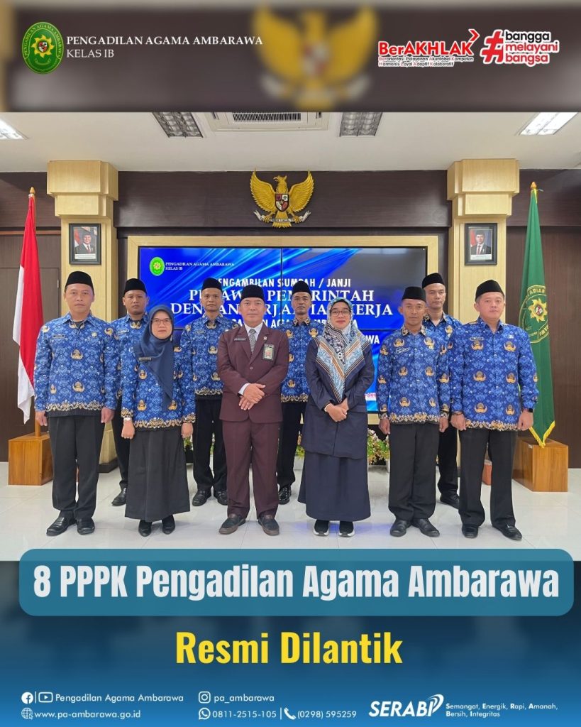 Ambarawa – Ketua Pengadilan Agama Ambarawa secara resmi melantik delapan Pegawai Pemerintah dengan Perjanjian Kerja (PPPK) pada Senin (1/9/2025) di aula Pengadilan Agama Ambarawa. Acara berlangsung khidmat dan penuh haru, dihadiri oleh para pejabat, pegawai, serta keluarga yang turut mendampingi. Dalam arahannya, Ketua Pengadilan Agama Ambarawa mengingatkan bahwa pelantikan ini merupakan rahmat Allah SWT yang […]