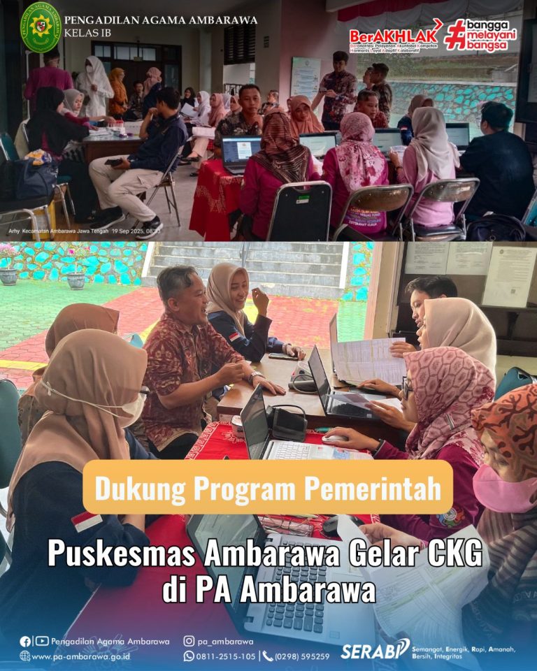 Ambarawa — Dalam rangka meningkatkan mutu pelayanan dan mendukung program pemerintah di bidang kesehatan, Pengadilan Agama Ambarawa bekerja sama dengan UPTD Puskesmas Ambarawa melaksanakan kegiatan Cek Kesehatan Gratis (CKG) pada Jumat, 19 September 2025. Kegiatan yang berlangsung di lingkungan Pengadilan Agama Ambarawa ini diikuti oleh seluruh pegawai, baik hakim, dan seluruh aparatur. Pemeriksaan kesehatan yang dilakukan meliputi pengukuran tekanan darah, pengukuran tinggi badan dan berat badan, pemeriksaan laboratorium seperti trigliserid dan gula darah, serta skrining kesehatan umum.