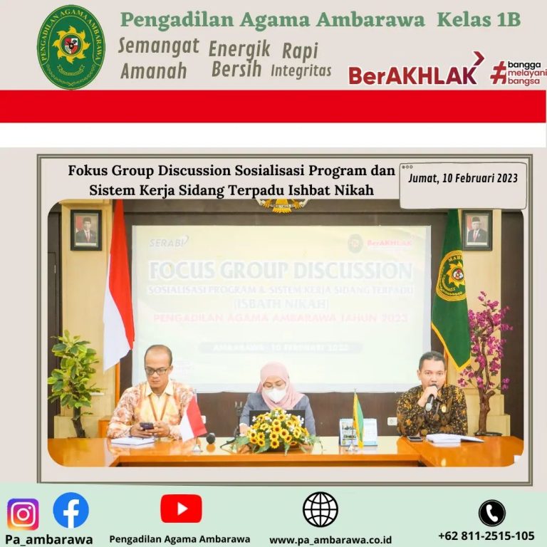 Bertempat di ruang aula Pengadilan Agama Ambarawa telah dilaksanakan Foucs Group Discussion (FGD) membahas sosialisasi program dan sistem kerja sidang terpadu. FGD ini dipimpin oleh Ketua Pengadilan Agama Ambarawa Ibu Hj. Izzatun Tiyas Rohmatin, S.H.I., S.H. M. H. didampingi oleh Wakil Ketua PA Ambarawa Bapak Mohammad Anton Dwi Putra, S.H., M.H.