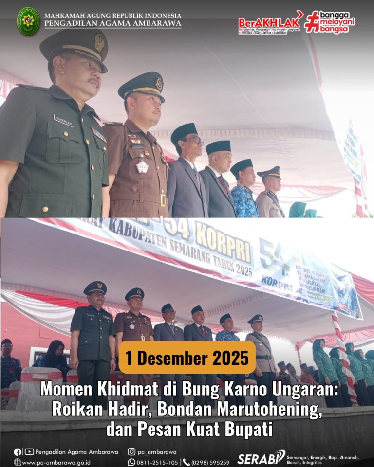 Ungaran- Senin (1/12/2025) Panitera Pengadilan Agama Ambarawa Ahmad Roikan, S.Sy., S.H., M.H. hadir bersama Bupati Semarang dalam Upacara HUT ke-54 KORPRI yang digelar di Lapangan Bung Karno, Ungaran, Kabupaten Semarang. Kehadiran para pimpinan instansi ini menegaskan soliditas antar-lembaga dalam memperkuat semangat pengabdian ASN di daerah.