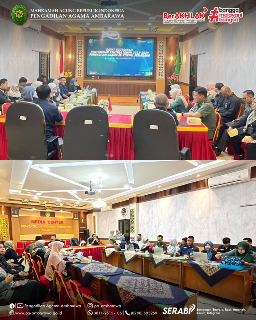 Pengadilan Agama Ambarawa mengikuti Rapat Koordinasi Penyusunan Rencana Strategis (Renstra) Tahun 2025–2029 untuk satuan kerja Pengadilan Agama se-Korwil Semarang yang dilaksanakan pada Senin–Selasa, 24–25 November 2025.