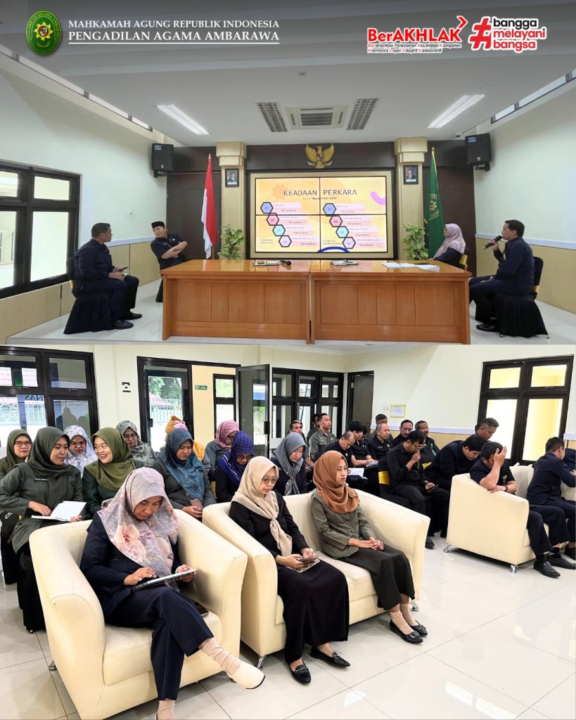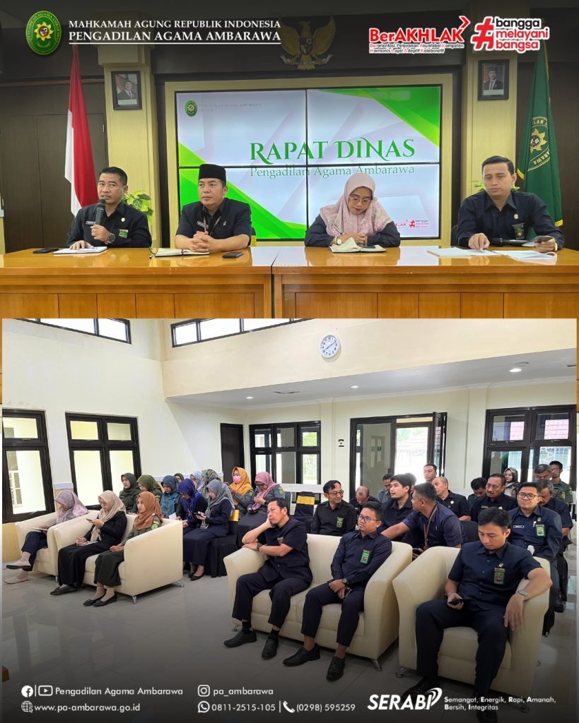 Ambarawa – Pengadilan Agama Ambarawa menggelar rapat dinas akhir tahun pada Senin, 9 Desember 2025, di aula kantor setempat. Rapat ini menjadi momentum konsolidasi sekaligus penajaman arah kerja menjelang tahun 2026. Dipimpin Ketua Pengadilan Agama Ambarawa, Muh. Irfan Husaeni, kegiatan tersebut diikuti seluruh jajaran hakim, kepaniteraan, dan kesekretariatan. Suasana rapat mencerminkan semangat kerja kolektif—menyingsingkan lengan baju, mengevaluasi capaian, dan menyiapkan langkah ke depan.
