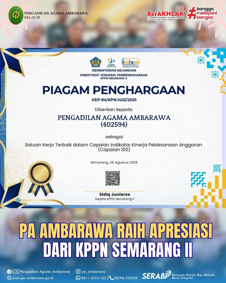 Ambarawa – Prestasi membanggakan kembali ditorehkan oleh Pengadilan Agama Ambarawa. Pada Semester I Tahun 2025, PA Ambarawa berhasil meraih tiga penghargaan dari Kantor Pelayanan Perbendaharaan Negara (KPPN) Semarang II berkat kinerja optimal dalam pengelolaan anggaran.