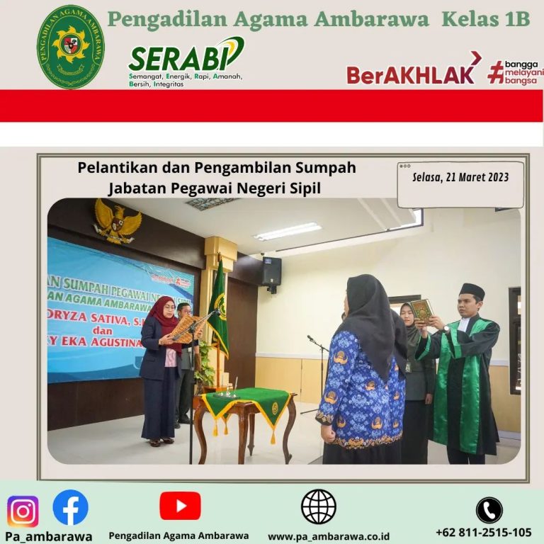 Acara Berlangsung dengan khidmat dan tertib sehingga proses acara pelantikan berjalan dengan lancar. Ketua Pengadilan Agama Ambarawa Hj. Izzatun Tiyas Rohmatin, S.H.I., S.H. M. H. . dalam sambutannya meberikan selamat kepada Sdri Rizky Eka Agustina, S. H., dan Oryza Sativa, S.H., menyampaikan bahwa sumpah Pegawai Negeri Sipil ini tidak hanya diucapkan, namun juga harus dapat dilaksanakan, ditanamkan dalam hati dan diamalkan dalam perbuatan. Sumpah/Janji Pegawai Negeri Sipil merupakan kewajiban bagi setiap Calon Pegawai Negeri Sipil segera setelah diangkat menjadi Pegawai Negeri Sipil untuk mengangkat Sumpah/Janji Pegawai Negeri Sipil menurut agama/kepercayaan, sesuai dengan ketentuan-ketentuan dalam Peraturan Pemerintah.