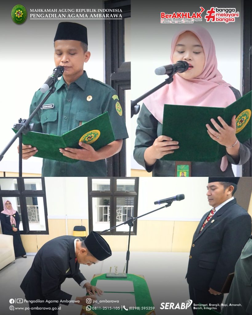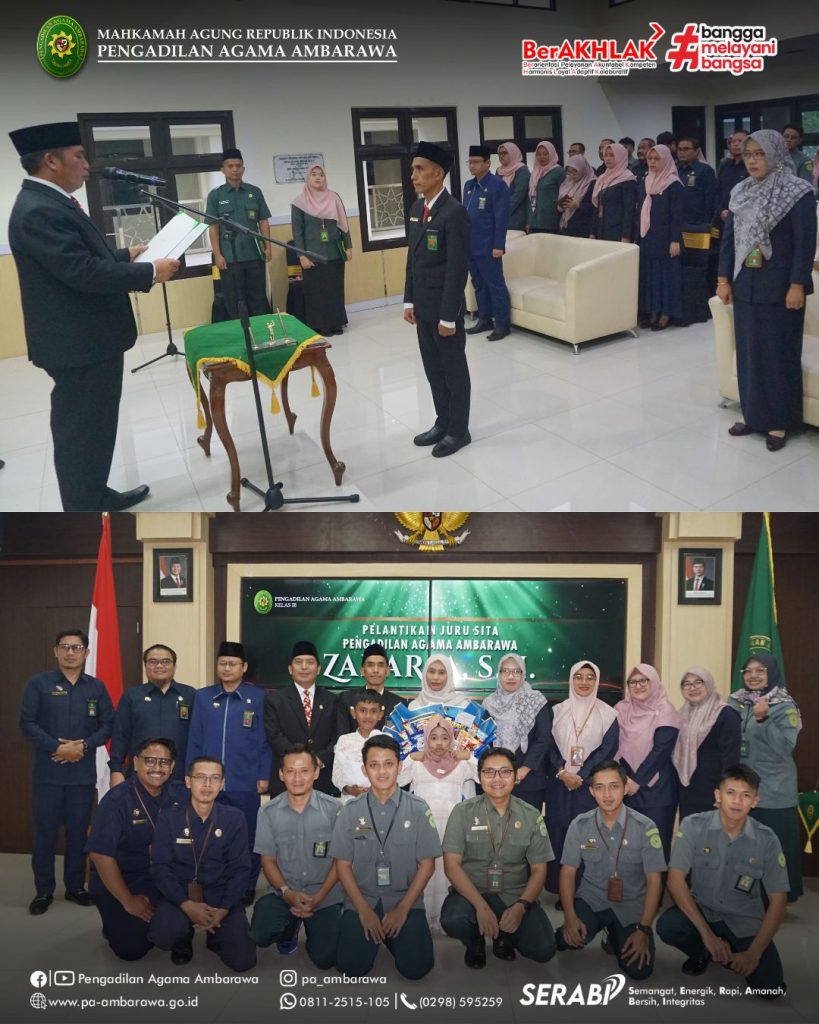 Ambarawa — Pengadilan Agama Ambarawa melaksanakan pelantikan Zakaria, S.H. sebagai Jurusita pada Rabu, 3 Desember 2025 di Aula Pengadilan Agama Ambarawa. Prosesi pelantikan dipimpin langsung oleh Ketua Pengadilan Agama Ambarawa, Muh. Irfan Husaeni, S.Ag., M.S.I.