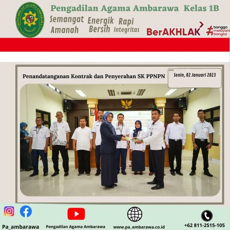 Senin, 2 Januari 2023 telah dilangsungkan penandatanganan oleh seluruh pegawai PPNPN. Bertempat di aula Kantor Pengadilan Agama Ambarawa setelah melakukan penandatanganan kemudian acara dilanjutkan dengan penyerahan kepada Ketua PA Ambarawa. Penyerahan SK PPNPN diwakili oleh Sekretaris Masnan Eri Yanto, S.E. lalu diserahkan kepada Ketua Pengadilan Agama Ambarawa Hj. Izzatun Tiyas Rohmatin, S.H.I., S.H. M. H.