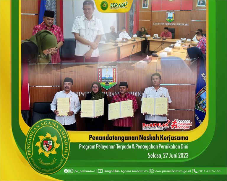 Pada hari Selasa, 27 Juni 2023 telah dilaksanakan kegiatan Penandatanganan Naskah Kerjasama Program Pelayanan Terpadu dan Pencegahan Pernikahan Dini, bertempat di Kantor Bupati Kabupaten Semarang. Kegiatan tersebut dihadiri oleh Bupati Kabipaten Semarang, Ketua Pengadilan Agama Ambarawa, Ketua Pengadilan Negeri Ungaran dan Kepala Kantor kementerian Agama Kabupaten Semarang.