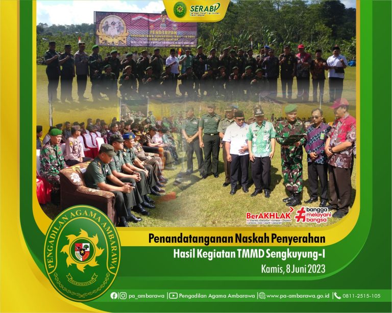 Hakim Pengadilan Agama Ambarawa, Khoirul Anam, S.H. menghadiri acara Penandatanganan Naskah Penyerahan Hasil Kegiatan TMMD Sengkuyung-I T.A. 2023 oleh Komandan KODIM 0714/SALATIGA slaku Dansatgas TMMD kepada Bupati Semarang pada hari Kamis, 8 Juni 2023 di lapangan Desa Kebonagung Kecamatan Sumowono Kabupaten Semarang