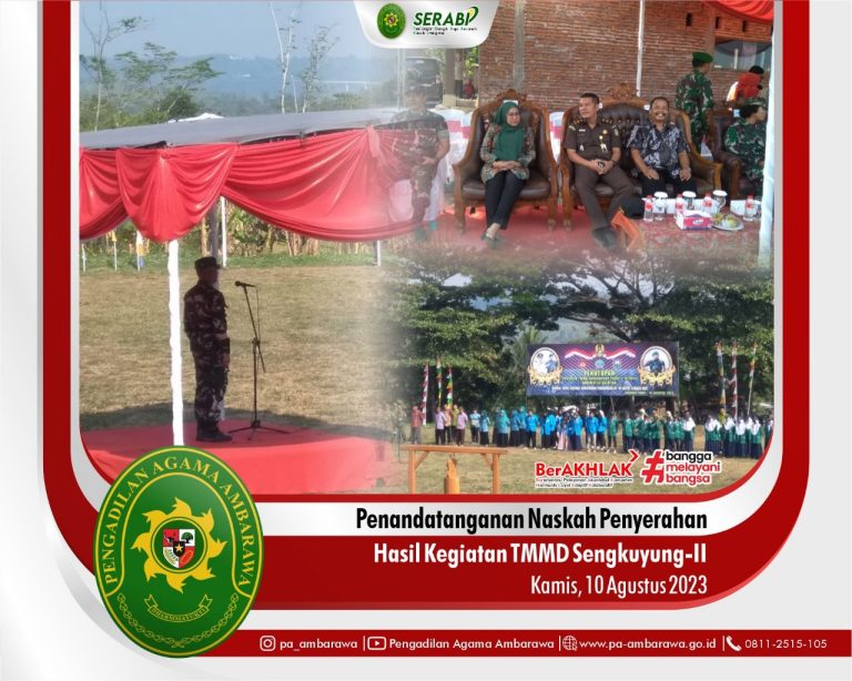 Ketua Pengadilan Agama Ambarawa, Hj. Izzatun Tiyas Rohmatin, S.H.I., S.H., M.H. menghadiri acara Penandatanganan Naskah Penyerahan Hasil Kegiatan TMMD Sengkuyung-II Tahun Anggaran 2023 oleh Komandan KODIM 0714/SALATIGA selaku Dansatgas TMMD kepada Bupati Semarang pada hari Kamis, 10 Agustus 2023 di Lapangan Desa Mluweh Kecamatan Ungaran Timur Kabupaten Semarang