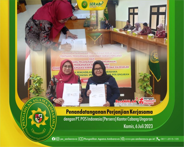 Bertempat di Ruang Aula Pengadilan Agama Ambarawa pada hari Kamis, 6 Juli 2023 telah dilaksanakan kegiatan Penandatangan Perjanjian Kerjasama Tentang Pengiriman Dokumen Surat Tercatat dan Tentang Pelayanan Jasa Pengiriman, Pembayaran Setoran PNPB, Penerimaan Transaksi Kiriman Weselpos dan Nazagelen Antara Pengadilan Agama Ambarawa dengan PT POS Indonesia (Persero) Kantor Cabang Ungaran.