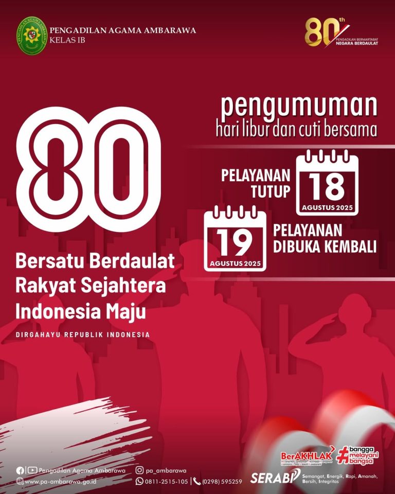 Pengumuman Hari Libur dan Cuti Bersama di Pengadilan Agama Ambarawa, pelayanan tutup pada tanggal 18 Agustus 2025 dan dibuka kembali pada tanggal 19 Agustus 2025