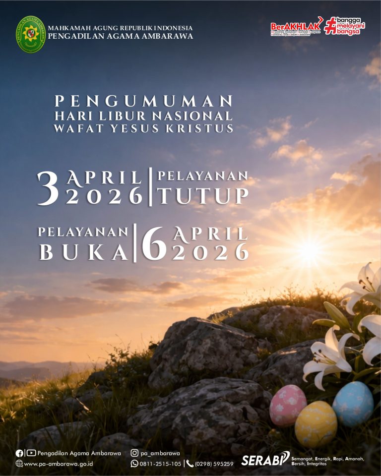Berdasarkan Surat Keputusan Bersama Menteri Agama, Menteri Ketenagakerjaan dan Menteri Pendayagunaan Aparatur Negara dan Reformasi Birokrasi Republik Indonesia, Nomor 1497 Tahun 2025, Nomor 2 Tahun 2025 dan Nomor 5 Tahun 2025, Tentang Libur Nasional dan Cuti Bersama. Bahwa Pada Tanggal 3 April 2026 Pelayanan di Pengadilan Agama Ambarawa tutup, dan dibuka kembali pada tanggal 6 April 2026