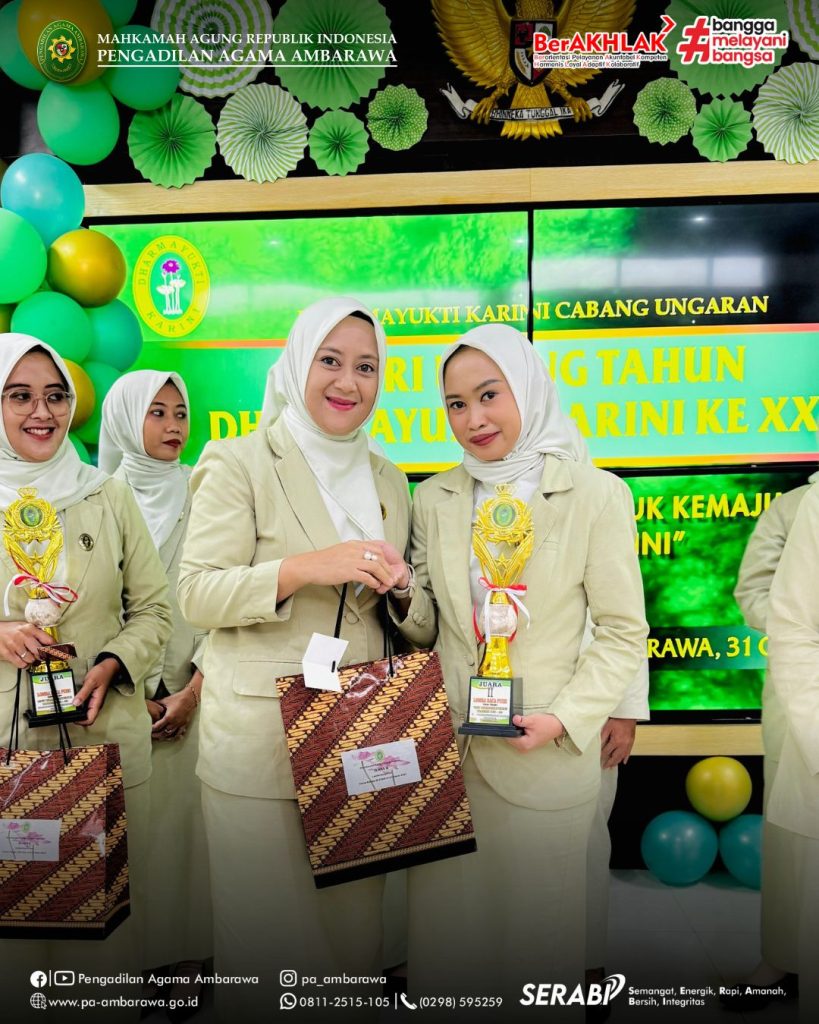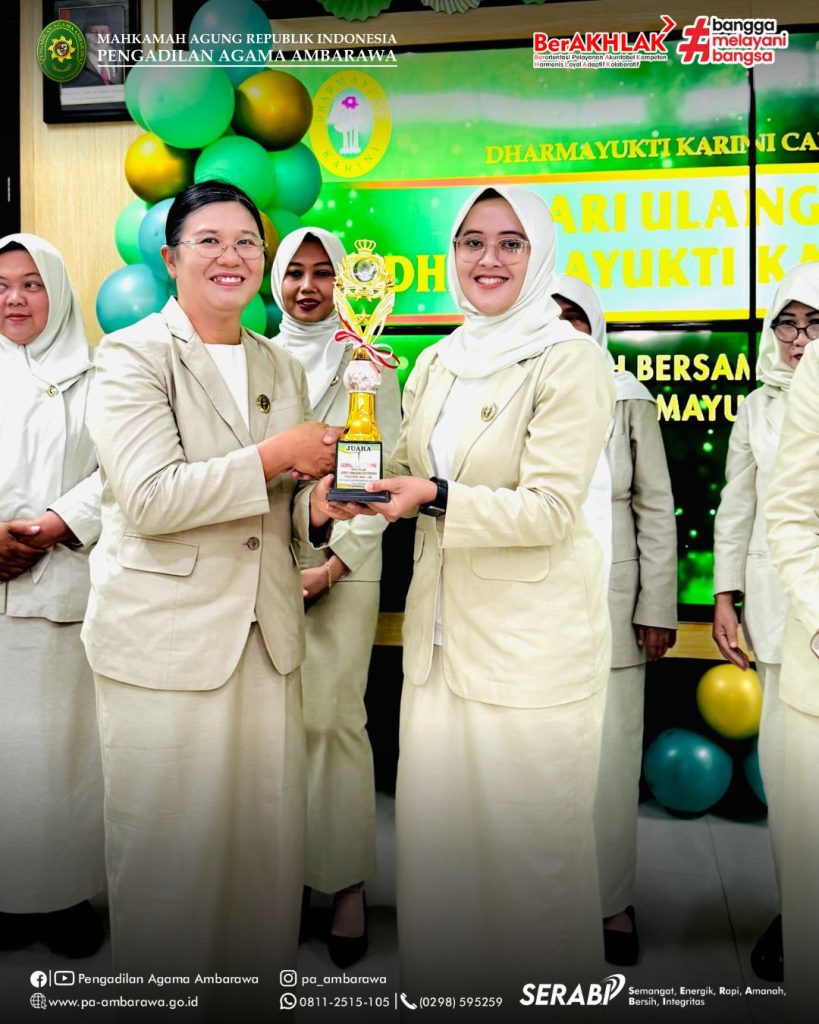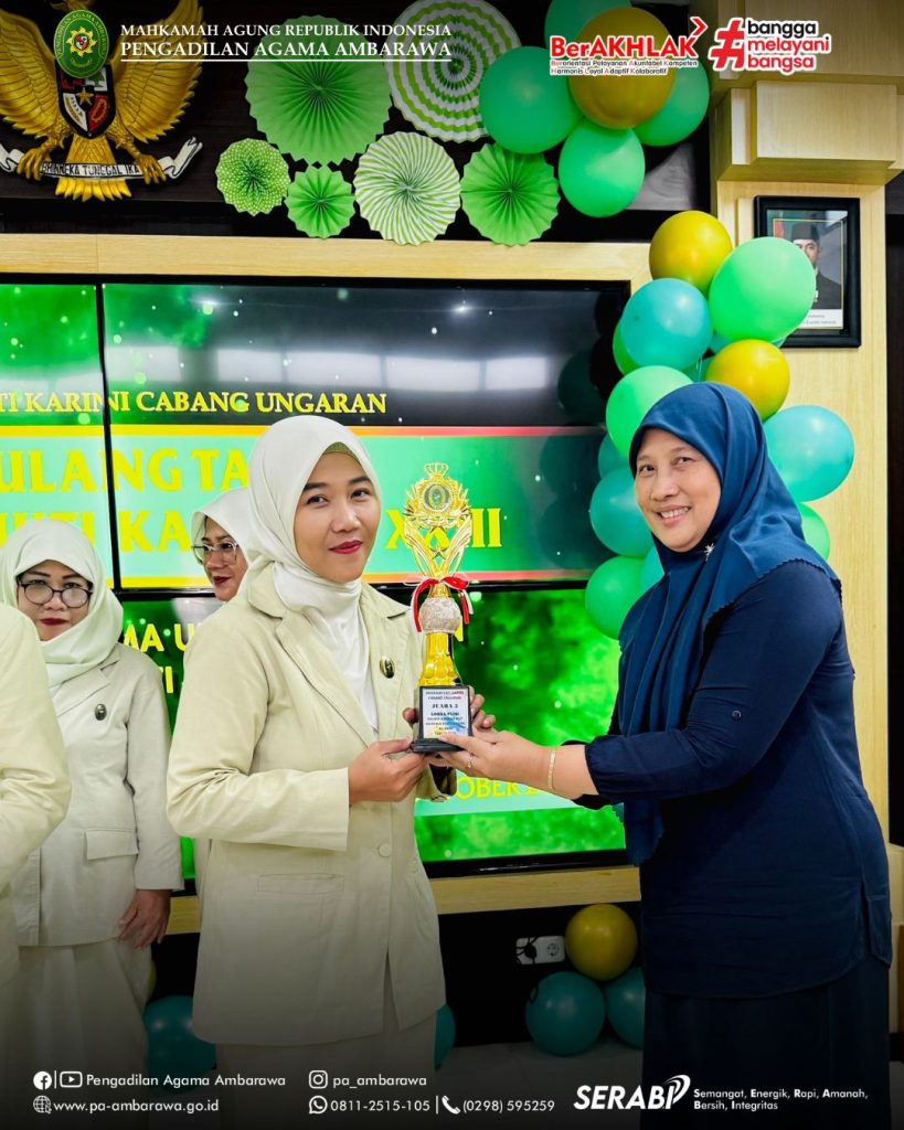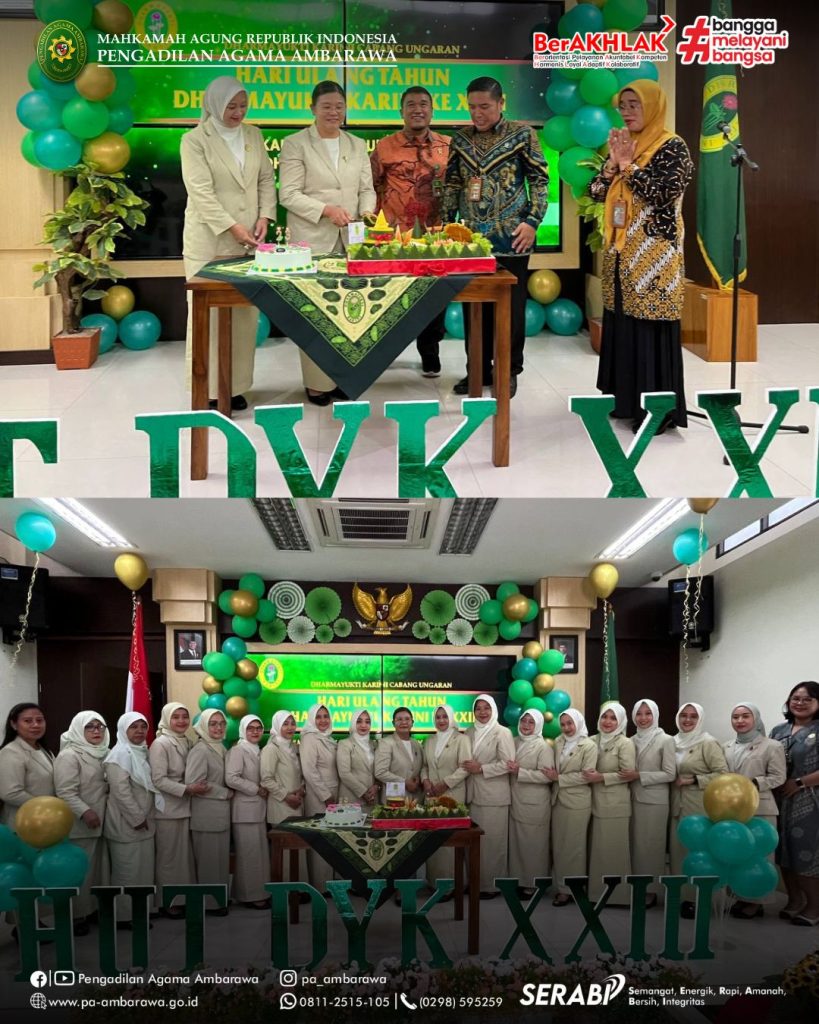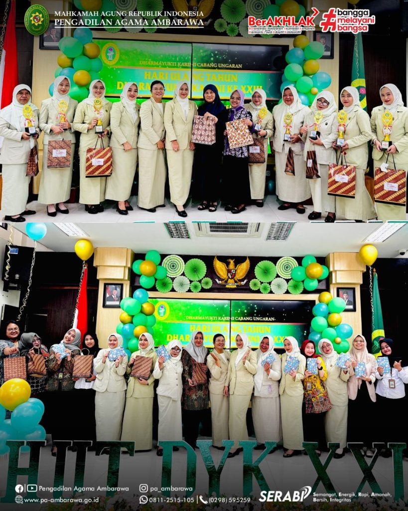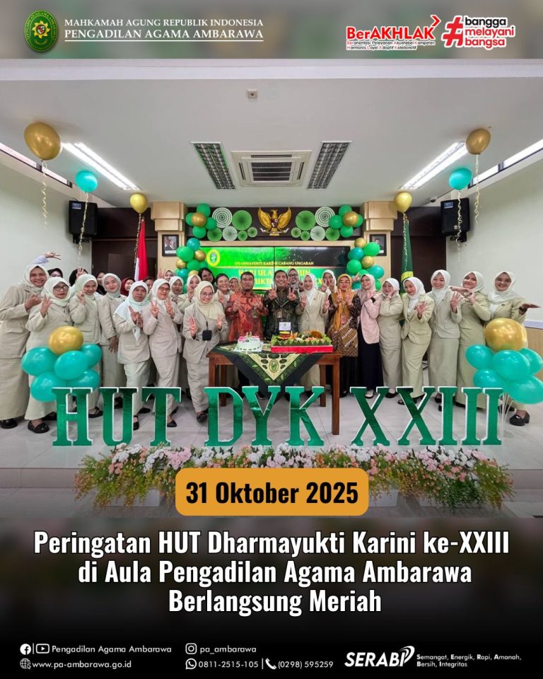 AMBARAWA — Dalam rangka memperingati Hari Ulang Tahun (HUT) Dharmayukti Karini ke-XXIII, Dharmayukti Karini Cabang Ungaran menyelenggarakan kegiatan perayaan pada Jumat, 31 Oktober 2025, bertempat di aula Pengadilan Agama Ambarawa. Acara tersebut dihadiri oleh Ketua Pengadilan Negeri Ungaran, Bapak Golom Sihotang, S.H., M.H., dan Ketua Pengadilan Agama Ambarawa, Bapak Muh. Irfan Husaini, S.Ag., M.Si., selaku Pelindung I dan Pelindung II Dharmayukti Karini Cabang Ungaran. Turut hadir pula Wakil Ketua, para Hakim, pejabat struktural dan fungsional, serta pengurus dan anggota Dharmayukti Karini Cabang Ungaran. Kegiatan diawali dengan sambutan pantun oleh pembawa acara yang mencairkan suasana dengan semangat dan keceriaan. Selanjutnya, seluruh hadirin menyanyikan lagu Indonesia Raya, Hymne Dharmayukti Karini, dan Mars Dharmayukti Karini secara khidmat yang dipandu oleh Ny. Lidia Yeri. Acara kemudian dilanjutkan dengan pembacaan doa oleh Ny. Eniroh Bara sebagai ungkapan rasa syukur atas terselenggaranya kegiatan dengan lancar. Setelah itu, Ketua Dharmayukti Karini Cabang Ungaran menyampaikan sambutannya yang berisi ucapan terima kasih dan apresiasi kepada seluruh anggota atas kekompakan dan dedikasi dalam menjalankan berbagai kegiatan organisasi. Sebagai wujud rasa syukur, acara dilanjutkan dengan pemotongan tumpeng oleh Ibu Ketua Dharmayukti Karini Cabang Ungaran, didampingi para Pelindung dan pengurus. Prosesi ini berlangsung penuh khidmat dan menjadi simbol kebersamaan serta kekompakan keluarga besar Dharmayukti Karini. Menambah semarak perayaan, panitia juga menggelar lomba pembacaan puisi antaranggota Dharmayukti Karini. Lomba ini menjadi ajang menyalurkan kreativitas dan ekspresi seni para anggota. Sebagai penutup, panitia mengumumkan pemenang lomba dan mengadakan pembagian doorprize yang disambut antusias oleh seluruh peserta. Gelak tawa dan keceriaan memenuhi ruangan, menciptakan suasana penuh kebahagiaan dan kekeluargaan.