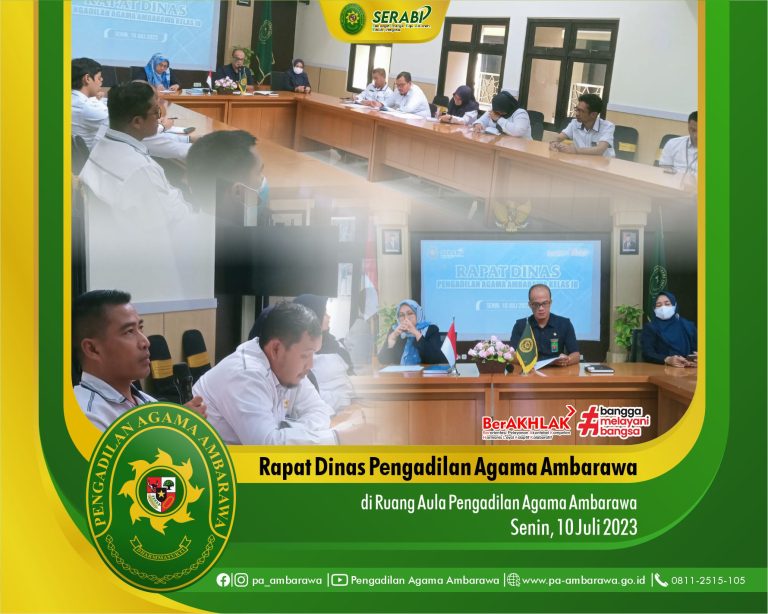 Senin, 10 Juli 2023 telah diadakan kegiatan Rapat Dinas Pengadilan Agama Amarawa yang bertempat di Ruang Aula Pengadilan Agama Ambarawa. Rapat Dinas tersebut dihadiri oleh Hakim, Panitera, Sekretaris, Panitera Muda, Kepala Subbagian, Staff dan PPNPN Pengadilan Agama Ambarawa.