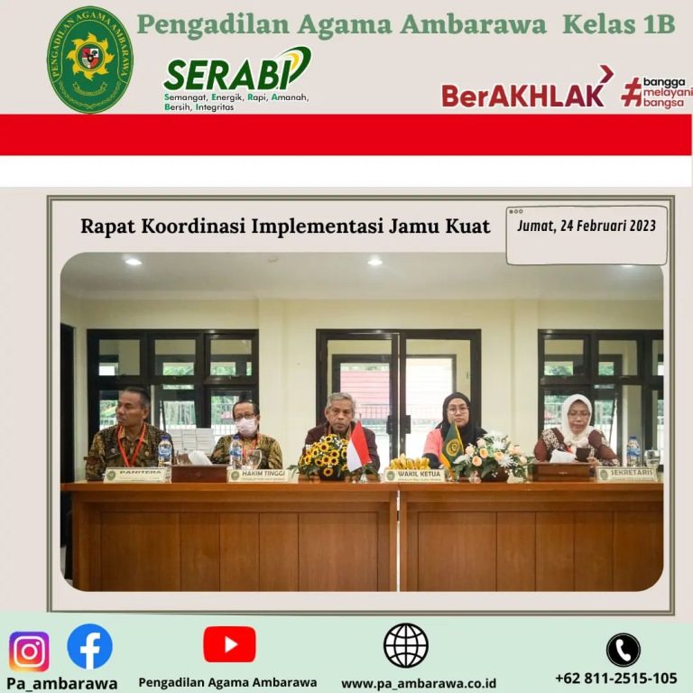 Bertempat di aula kantor Pengadilan Agama Ambarawa dilaksanakan rapat koordinasi implementasi aplikasi berbasis web yaitu jamu kuat. Rapat ini dihadiri oleh Wakil Ketua PTA Semarang Bapak YM. Drs. H. Muhammad Alwi, M. H., beserta Hakim Tinggi Pengadilan Agama Semarang, Sekretaris, Panitera dan Ketua PA Ambarawa Ibu Hj. Izzatun Tiyas Rohmatin, S.H.I., S.H. M. H.