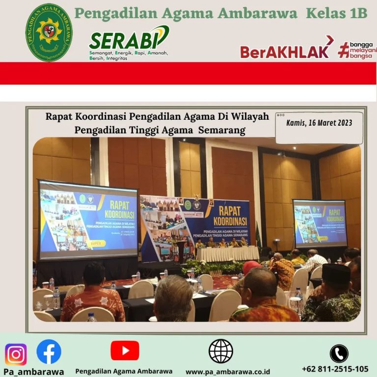Sesuai dengan undangan rapat kerja daerah Ketua Pengadilan Agama Ambarawa Hj. Izzatun Tiyas Rohmatin, S.H.I., S.H. M. H., beserta Panitera Muh. Amin. S. H., M. H., Dan Sekretaris Masnan Eri Yanto, S.E. menghadiri rapat koordinasi. Bertempat di Grand Mercure, Solo Baru Jawa Tengah rakor dilaksanakan.