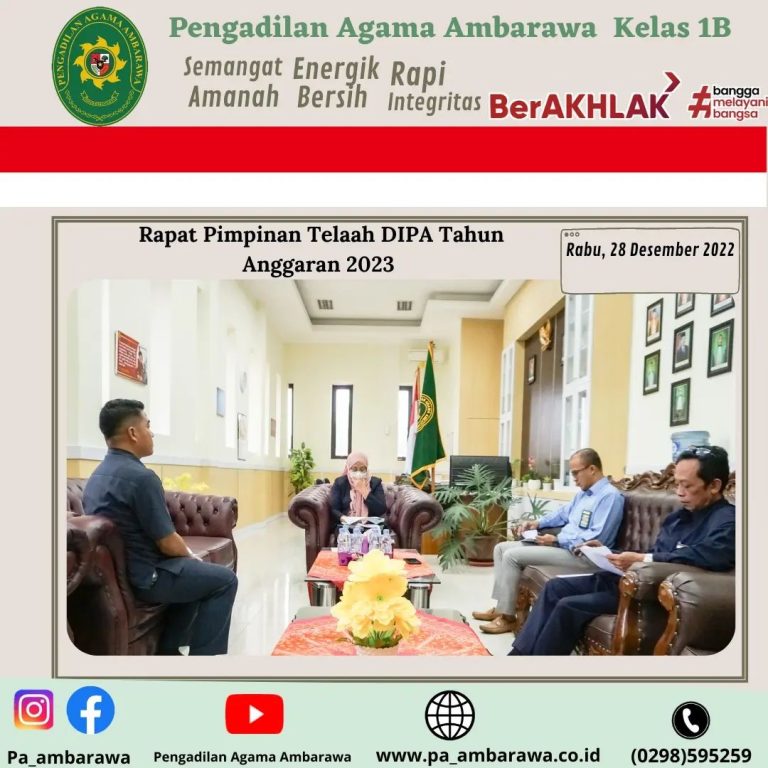Ketua Pengadilan Agama Ambarawa mengadakan rapat pimpinan telaah DIPA tahun anggaran 2023. Rapat dipimpin oleh Ibu ketua Hj. Izzatun Tiyas Rohmatin, S.H.I., S.H. M. H. dengan anggota rapat terdiri oleh wakil ketua pengadilan Agama Ambarawa, Panitera dan juga sekretaris.