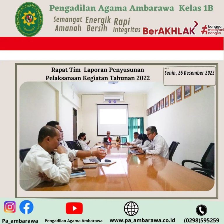 Kantor Pengadilan Agama Ambarawa melaksanakan rapat laporan pelaksanaan kegiatan tahunan 2022. Rapat dipimpin oleh Bapak Wakil Ketua Muhammad Anton Dwi Putra S.H. M.H. dengan membahas program yang telah dilakukan ditahun ini serta evaluasi secara keseluhttps://pa-ambarawa.go.idwp-content/uploads/2025/11/IMG_4224-1-1170×650-1.jpg oleh masing-masing Bidang Kepaniteraan dan kesekretariatan.