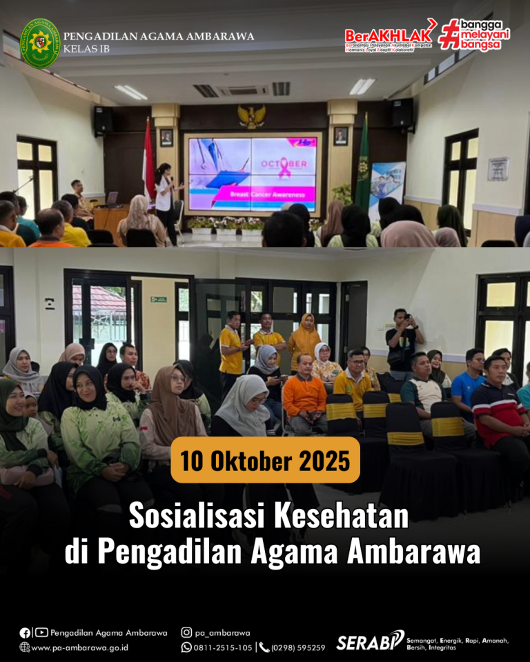 Ambarawa — Dalam rangka meningkatkan kesadaran akan pentingnya menjaga kesehatan, Pengadilan Agama Ambarawa bekerja sama dengan Bank Syariah Indonesia dan Rumah Sakit Ken Saras Kabupaten Semarang menggelar kegiatan Sosialisasi Kesehatan pada Jumat, 10 Oktober 2025, bertempat di aula Pengadilan Agama Ambarawa.