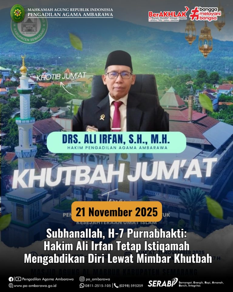 UNGARAN — Menjelang tujuh hari masa purnabhakti, Hakim Pengadilan Agama Ambarawa, Drs. Ali Irfan, S.H., M.H., kembali menunjukkan keteladanannya. Pada Jumat, 21 November 2025, beliau menyampaikan khutbah terakhir di Masjid Agung Al Mabrur Ungaran, amanah yang telah dijalankannya bertahun-tahun, meski masa dinasnya berakhir 1 Desember 2025.