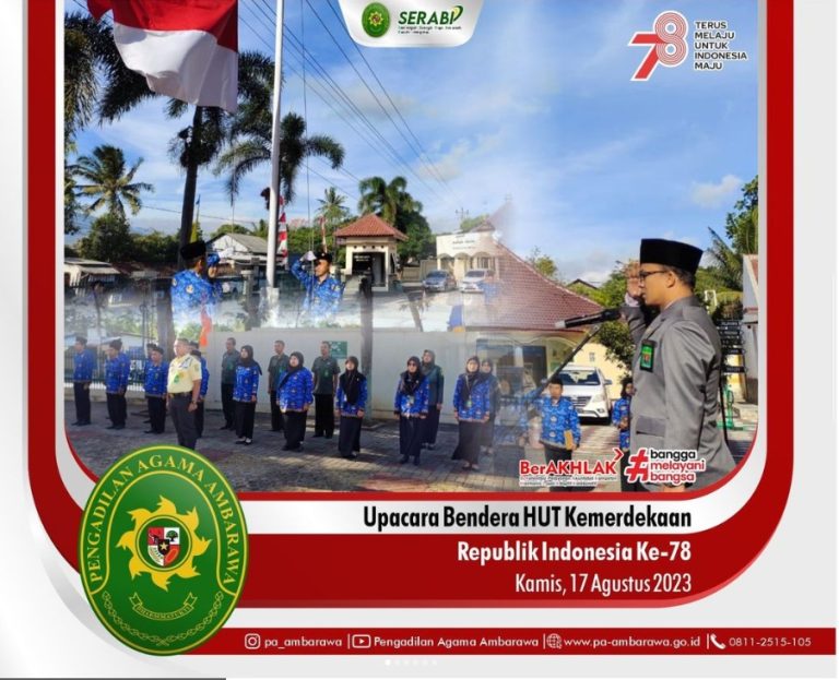 Bertempat di halaman depan Pengadilan Agama Ambarawa pada hari Kamis, 17 Agustus 2023, Pengadilan Agama Ambarawa melaksanakan Upcara Pengibaran Bendera HUT Kemerdekaan Republik Indonesia ke-78 yang diikuti oleh Pimpinan, Hakim, ASN dan PPNPN Pengadilan Agama Ambarawa.