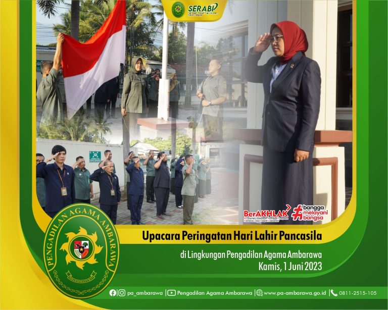 Bertempat di halaman depan Pengadilan Agama Ambarawa pada hari Kamis, 1 Juni 2023, segenap Pimpinan, Hakim, Pegawai dan Staff Pengadilan Agama Ambarawa telah melaksanakan Upacara Peringatan Hari Lahir Pancasila.
